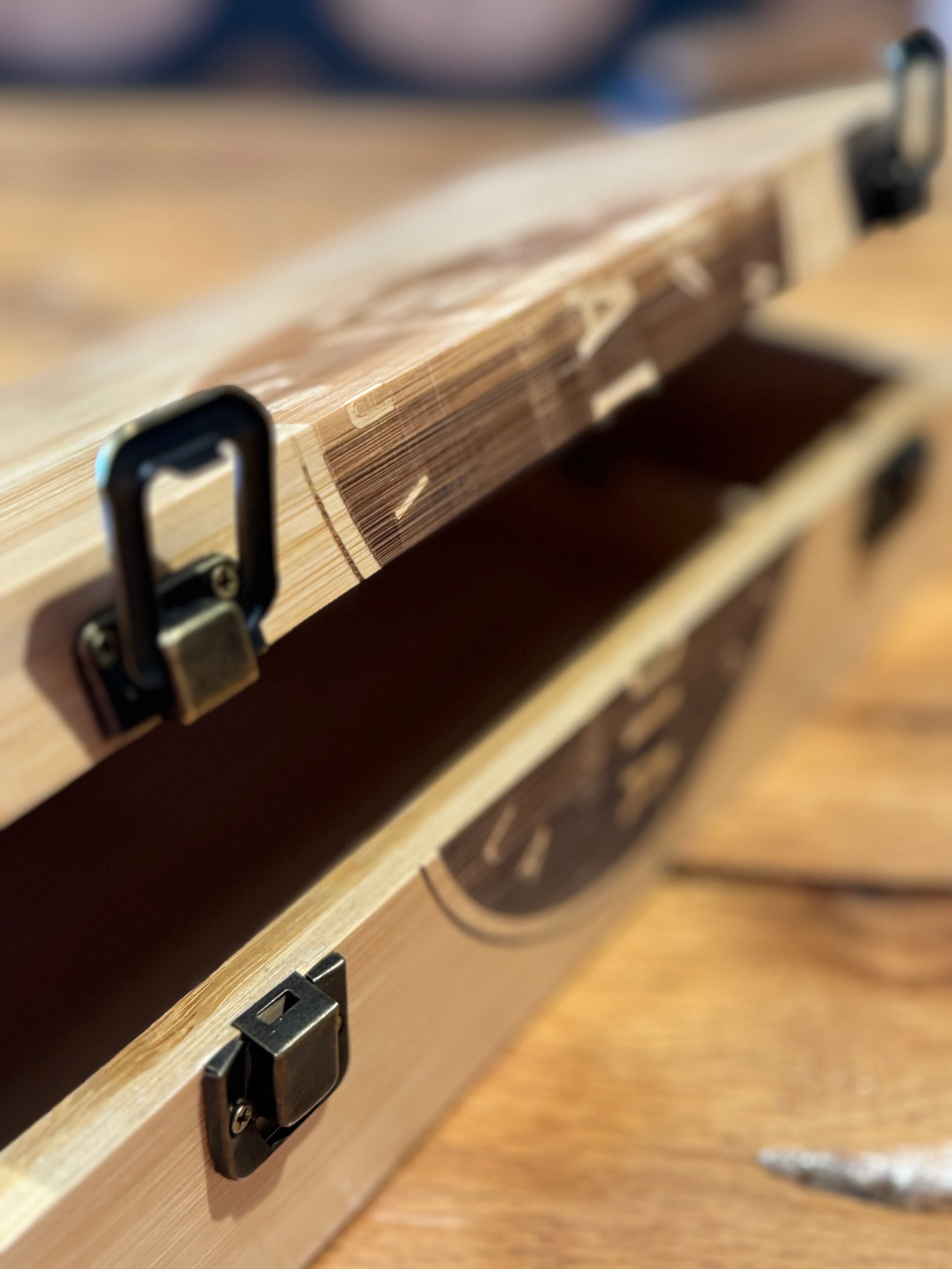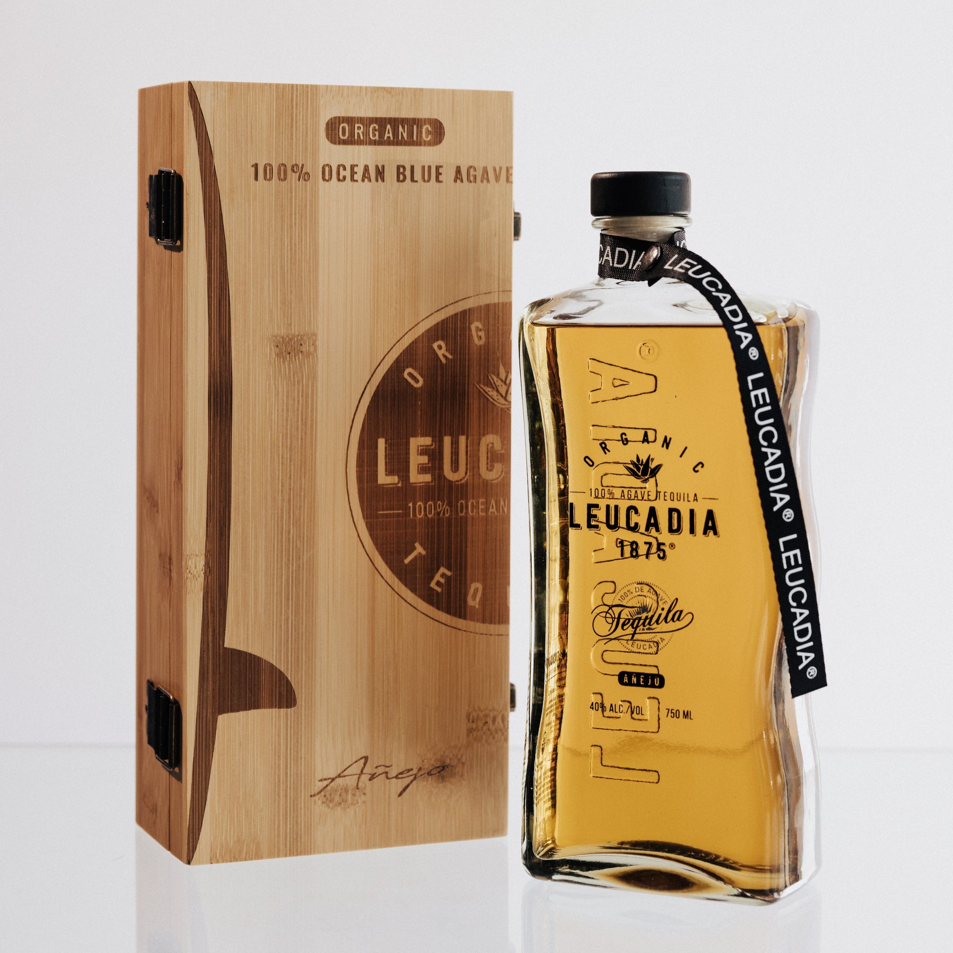Add a beautiful, hand carved, hinged Leucadia® bamboo box for your tequila to rest in. This box is absolutely beautiful. The surfboard and Leucadia® logo are carved into the wood with brass hinges and latches. The box also holds the bottle securely with a wooden neck lock. This is how tequila should be seen!